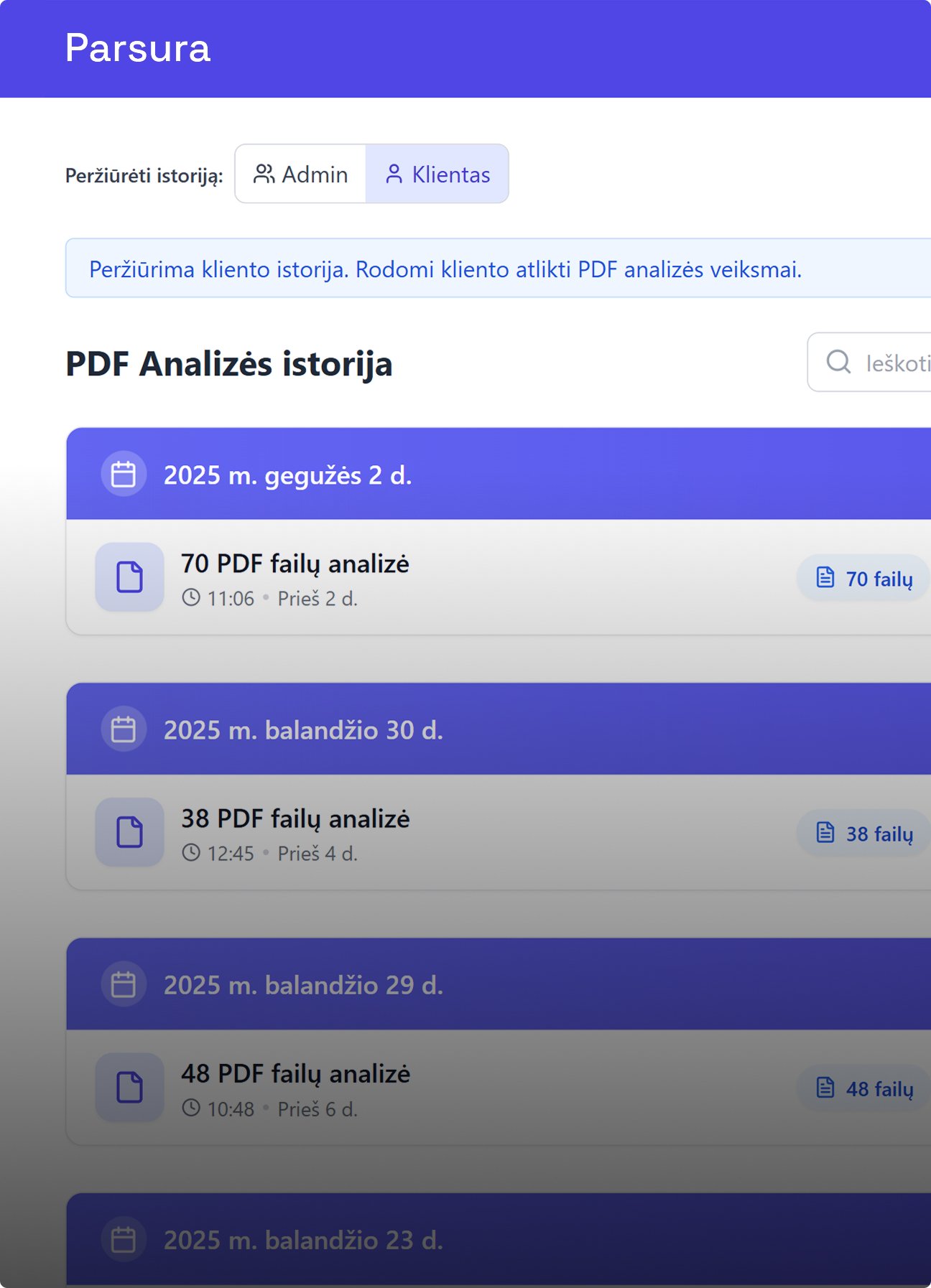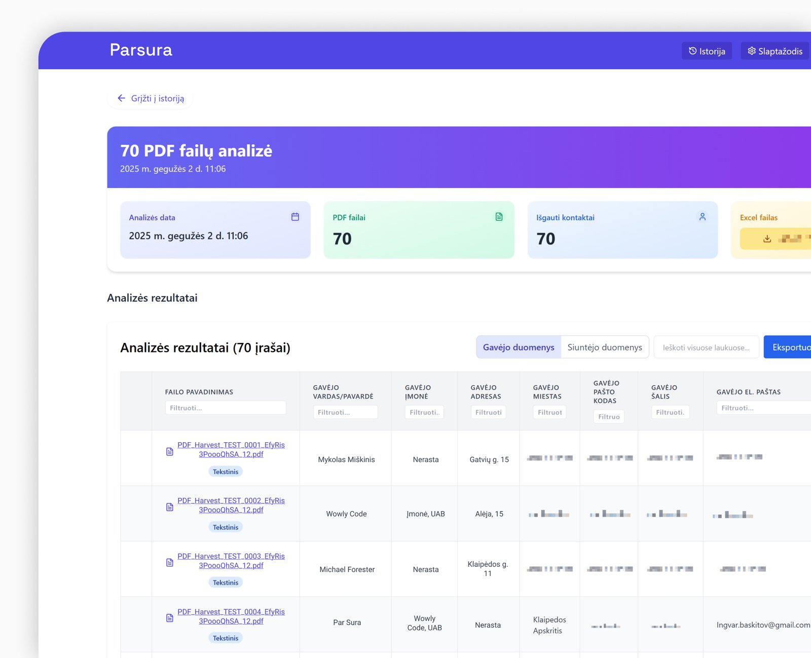 Gaukite paruoštą CSV/Excel ataskaitą vos vienu mygtuko paspaudimu arba siųskite duomenis tiesiai į savo sistemą. Viskas automatizuota, nereikia papildomo rankinio darbo. Kiekviena analizė laikoma istorijoje, kurioje galima ieškoti ir filtruoti pagal duomenis, failų pavadinimus, analizės datas.